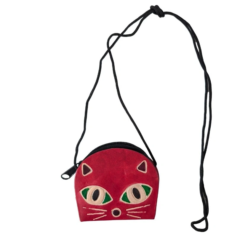Portmonetka skórzana na sznurku, portfelik czerwony kot