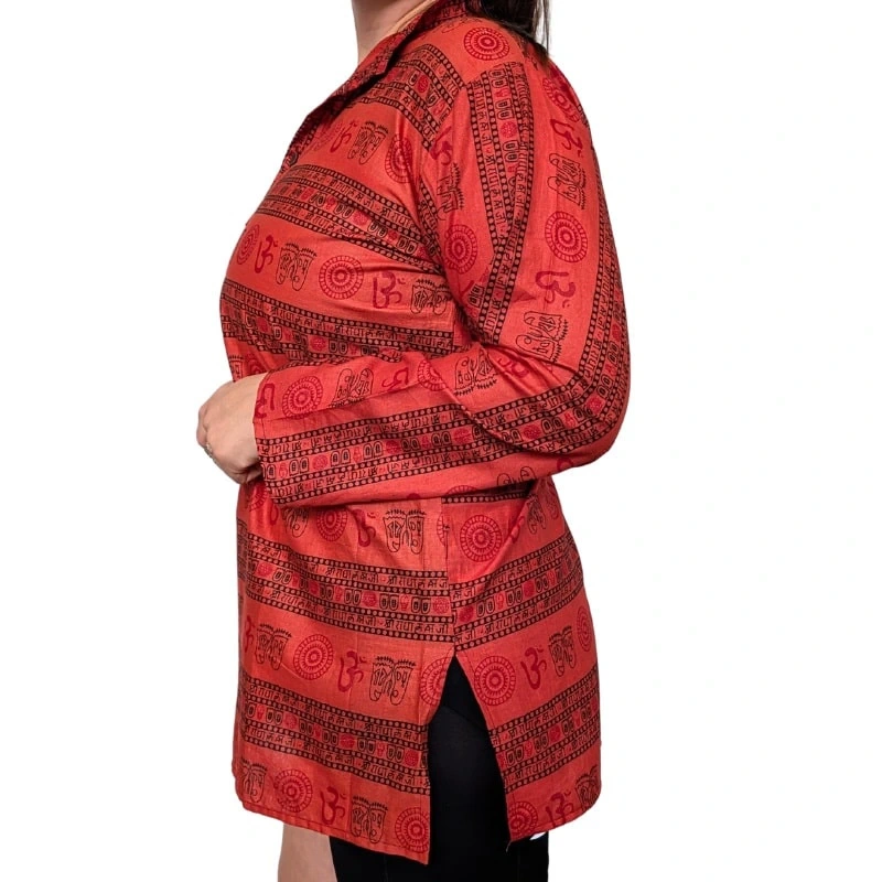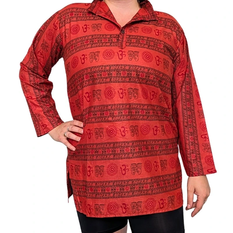 - Wygodna, przewiewna i stylowa koszula bawełniana w indyjskim stylu to doskonały wybór zarówno dla kobiet, jak i mężczyzn. Wzór z symbolami „Om” (Ohm) i motywami etnicznymi nadaje jej wyjątkowego charakteru.