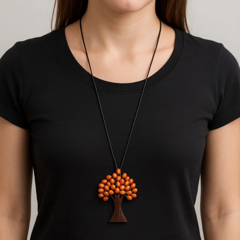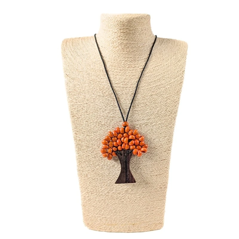 Ten ręcznie wykonany naszyjnik w kształcie drzewa z drewnianym pniem i koralikami w odcieniach pomarańczowych to nie tylko piękna ozdoba, ale i symbol życia, siły i harmonii. Idealny dla miłośników etnicznego stylu i naturalnych dodatków.