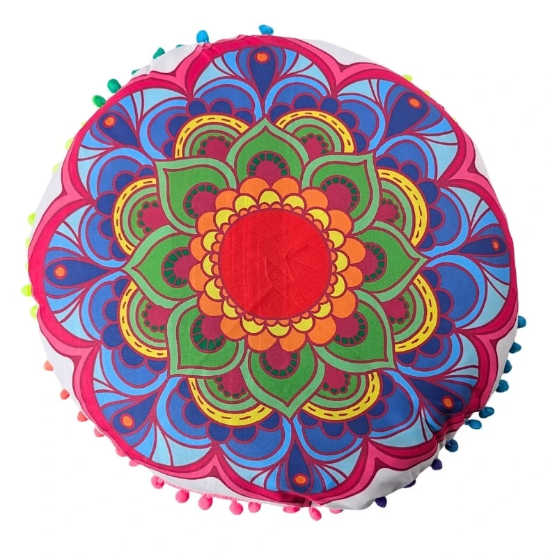 Ta dekoracyjna poduszka, pufa z motywem kolorowej mandali to idealny akcent dla miłośników stylu boho, orientu i kolorów inspirowanych naturą. Wzór mandali przyciąga wzrok i wprowadza do wnętrza harmonię, kolor i odrobinę egzotyki.