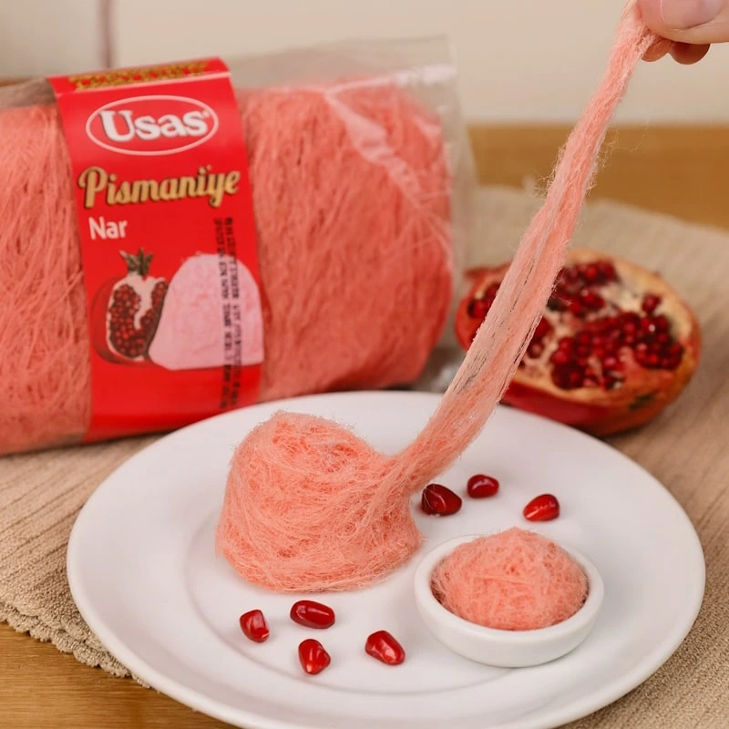Choć często porównywane do chałwy, pişmaniye to zupełnie inny deser. Chałwa ma zwartą, ciężką strukturę, podczas gdy pişmaniye jest lekkie, włókniste i rozpływa się w ustach. Dzięki temu przypomina niezwykły kłębek wełny, pełen słodyczy i aromatu. Wersja z owocową nutą granatu lub posypana orzechami sprawia, że każdy kęs to wyjątkowa podróż do świata orientu.