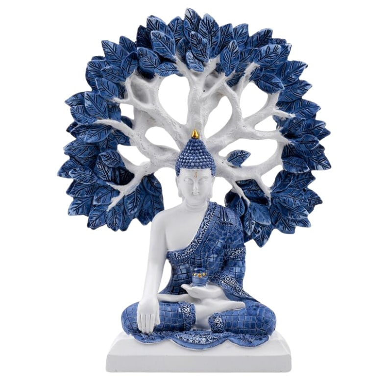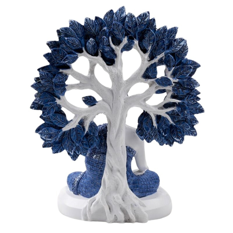 Figurka Buddy to wyjątkowa dekoracja o głębokim znaczeniu symbolicznym. Przedstawia Buddę w pozycji medytacyjnej, siedzącego pod drzewem, które symbolizuje przebudzenie, wewnętrzny spokój i duchową mądrość. Utrzymana w odcieniach bieli i błękitu, przyciąga uwagę subtelnym wykonaniem i spokojną energią, wprowadzając do wnętrza harmonię i równowagę.