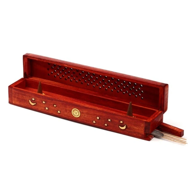 Zamykane pudełko na kadzidełka, wykonane z drewna egzotycznego mango z motywem złotego słońca i gwiazd.