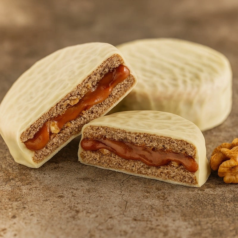 Ich delikatna struktura, kremowe nadzienie dulce de leche oraz aromatyczne orzechy włoskie tworzą deser o wyjątkowym, głębokim smaku. Każde ciastko oblane jest warstwą białej czekolady, która dodaje słodyczy i elegancji, tworząc idealną równowagę między miękkim wnętrzem a delikatną polewą.