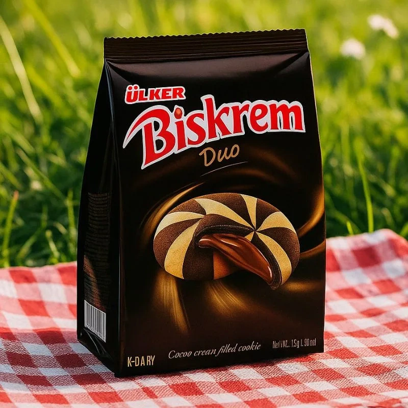 Biskrem Duo to połączenie dwóch smaków w jednym ciasteczku – delikatnie kruchego, dwukolorowego ciasta i aksamitnego kremu czekoladowego ukrytego w środku. Każdy kęs to harmonia słodyczy i kakaowej intensywności, która zachwyci miłośników deserów w stylu tureckim. Ich charakterystyczny wygląd i wyrazisty smak sprawiają, że trudno poprzestać na jednym.