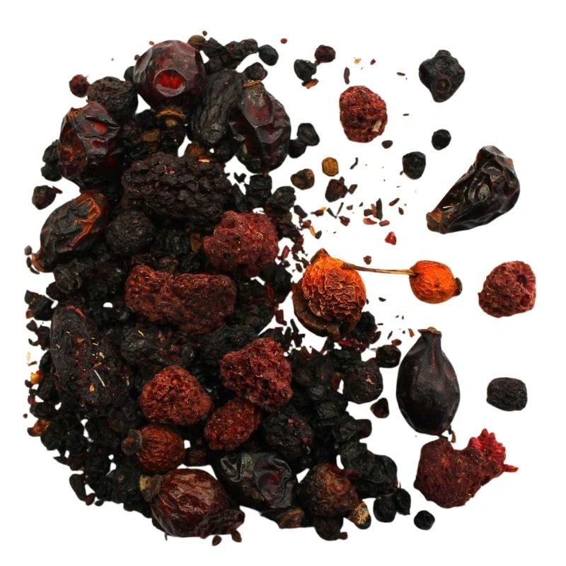 - Skład: owoc dzikiej róży 25%, hibiskus 30%, owoc czarnego bzu 25%, porzeczka czarna owoc 5%, jagoda 5%, aronia 5%, malina 5%