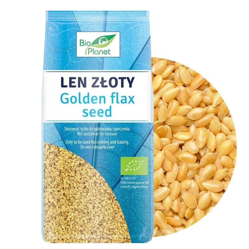 • Len złoty Bio Planet to ekologiczne ziarna o delikatnym smaku, stanowiące bogate źródło błonnika, białka oraz zdrowych kwasów tłuszczowych omega-3.