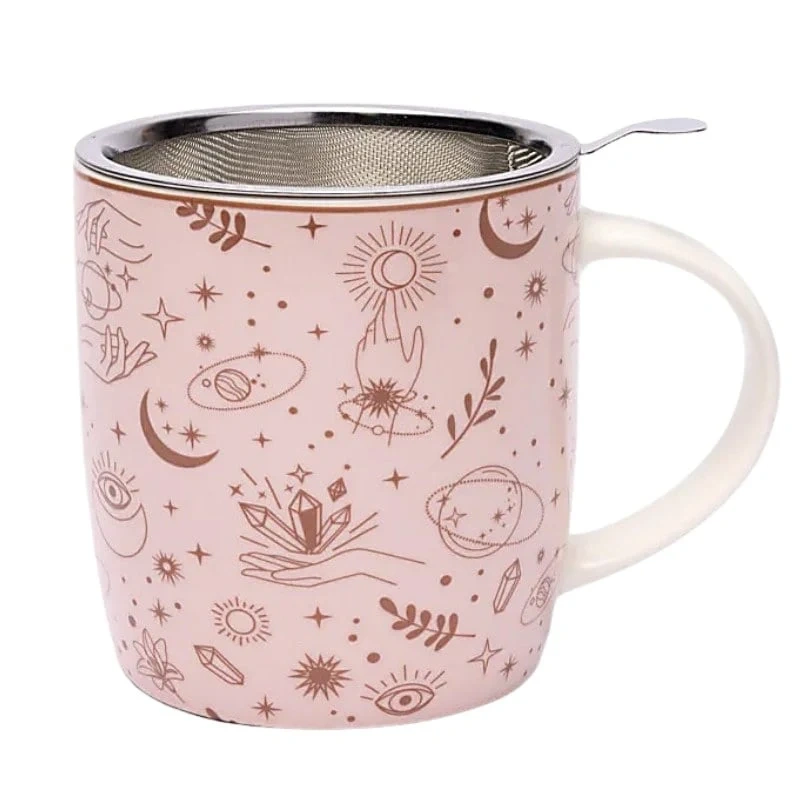 Stylowy kubek z sitkiem, idealny dla osób, które kochają rytuały parzenia herbaty i estetykę pełną symboli, planet, księżyców i kryształów. To praktyczny i piękny dodatek dla każdego miłośnika ziół, naparów i chwil relaksu.