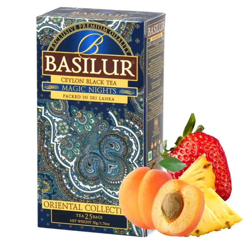 Basilur Magic Nights to czarna herbata cejlońska o wyjątkowym, owocowym aromacie truskawki, moreli, ananasa i papai.