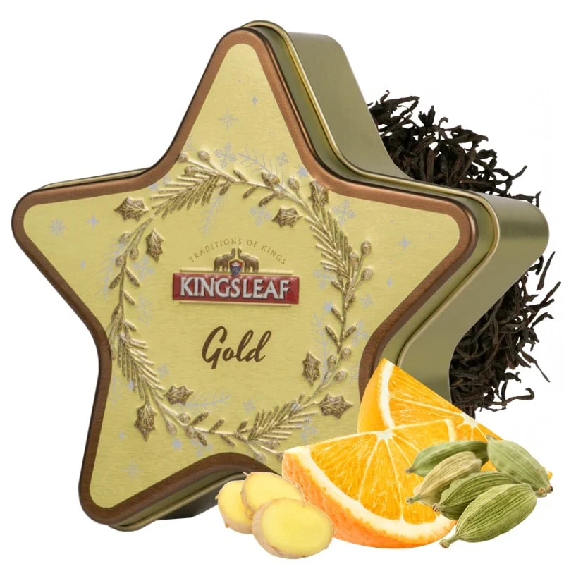 Kingsleaf Gold to wyjątkowa czarna herbata cejlońska zamknięta w efektownej, świątecznej puszce w kształcie złotej gwiazdy. To idealny prezent dla bliskiej osoby oraz piękna ozdoba, która doda blasku każdemu zimowemu wnętrzu.