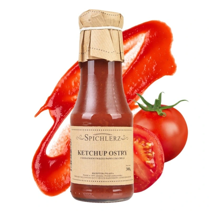 Ostry ketchup Spichlerz - klasyczny smak pomidorów, prosty skład i wyraźna pomidorowa baza.