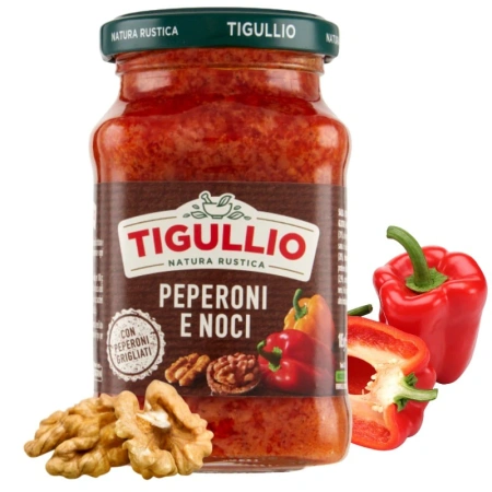 Pesto z papryki i orzechów włoskich Tigullio - wyraźne, warzywne nuty z orzechową głębią.