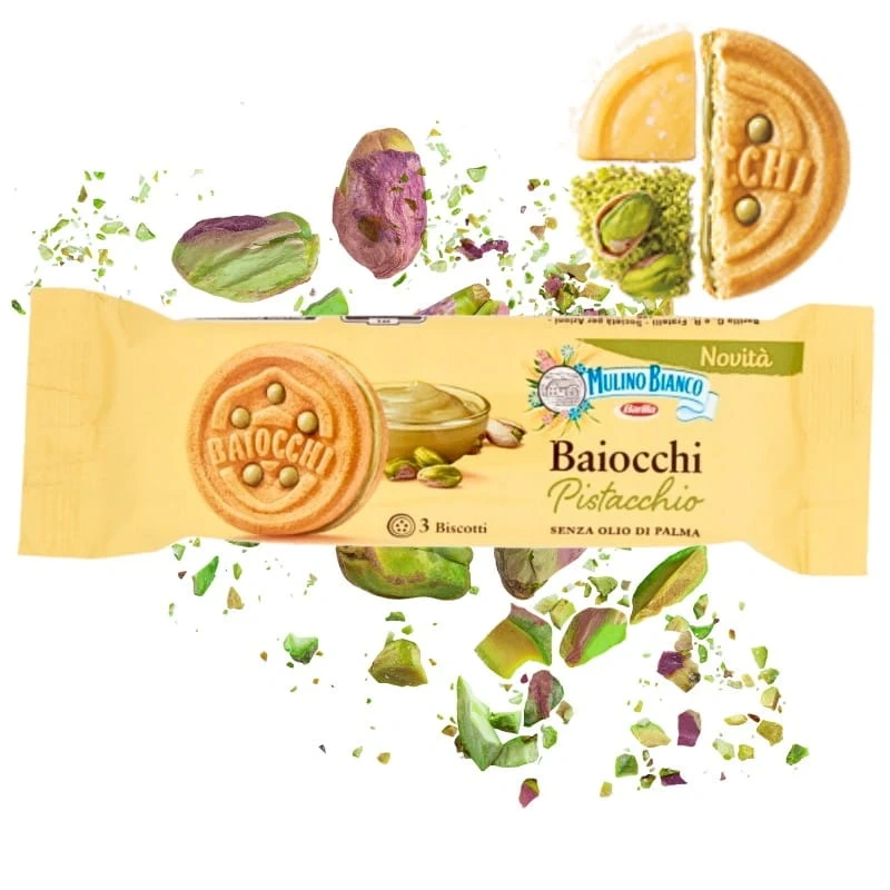 - Baiocchi Pistacchio to kruche, okrągłe ciastka z nadzieniem pistacjowym, które smakują jak gotowy mały deser do kawy.