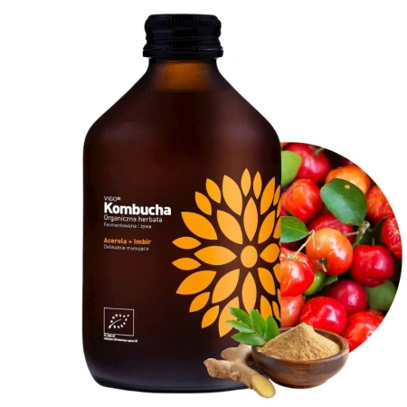 - Kombucha BIO na bazie fermentowanej herbaty z dodatkiem aceroli i imbiru. Jest to napój „fermentowany i żywy”, czyli taki, w którym kluczową rolę gra naturalny proces fermentacji.